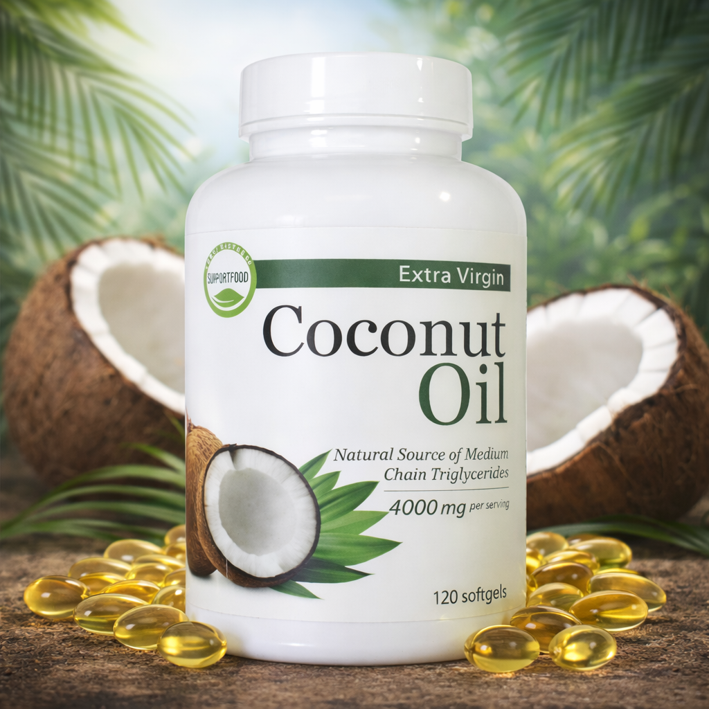 Aceite de Coco Extra Virgen en cápsulas blandas, fuente natural de MCT, ideal para apoyar la energía, el metabolismo y el bienestar diario.