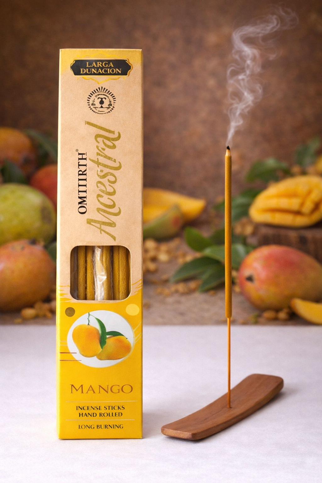 Incienso artesanal de mango, enrollado a mano y de quema larga, con aroma dulce y frutal.