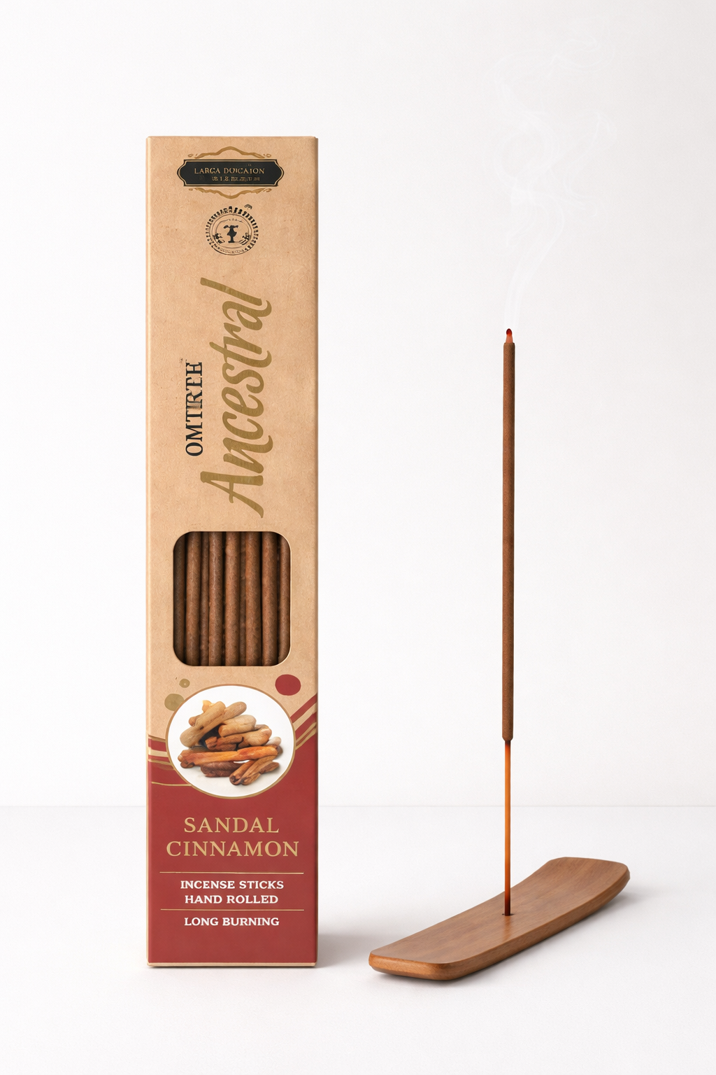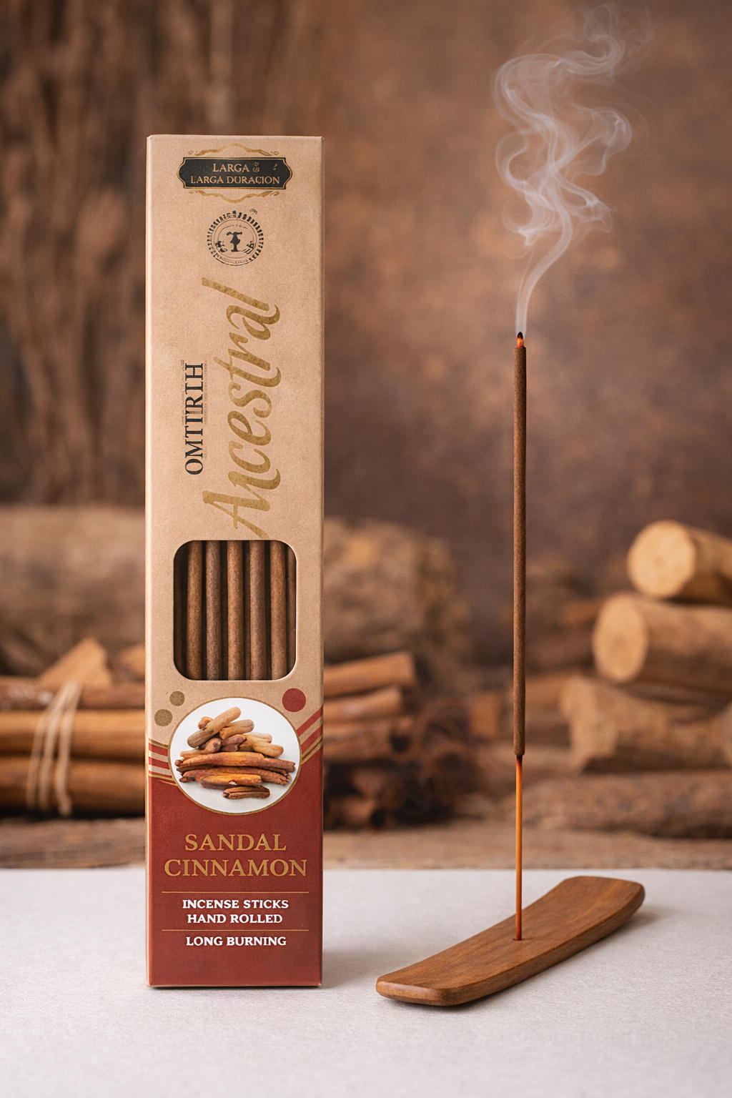 Incienso artesanal de sándalo y canela, enrollado a mano y de quema larga, con aroma cálido y envolvente.