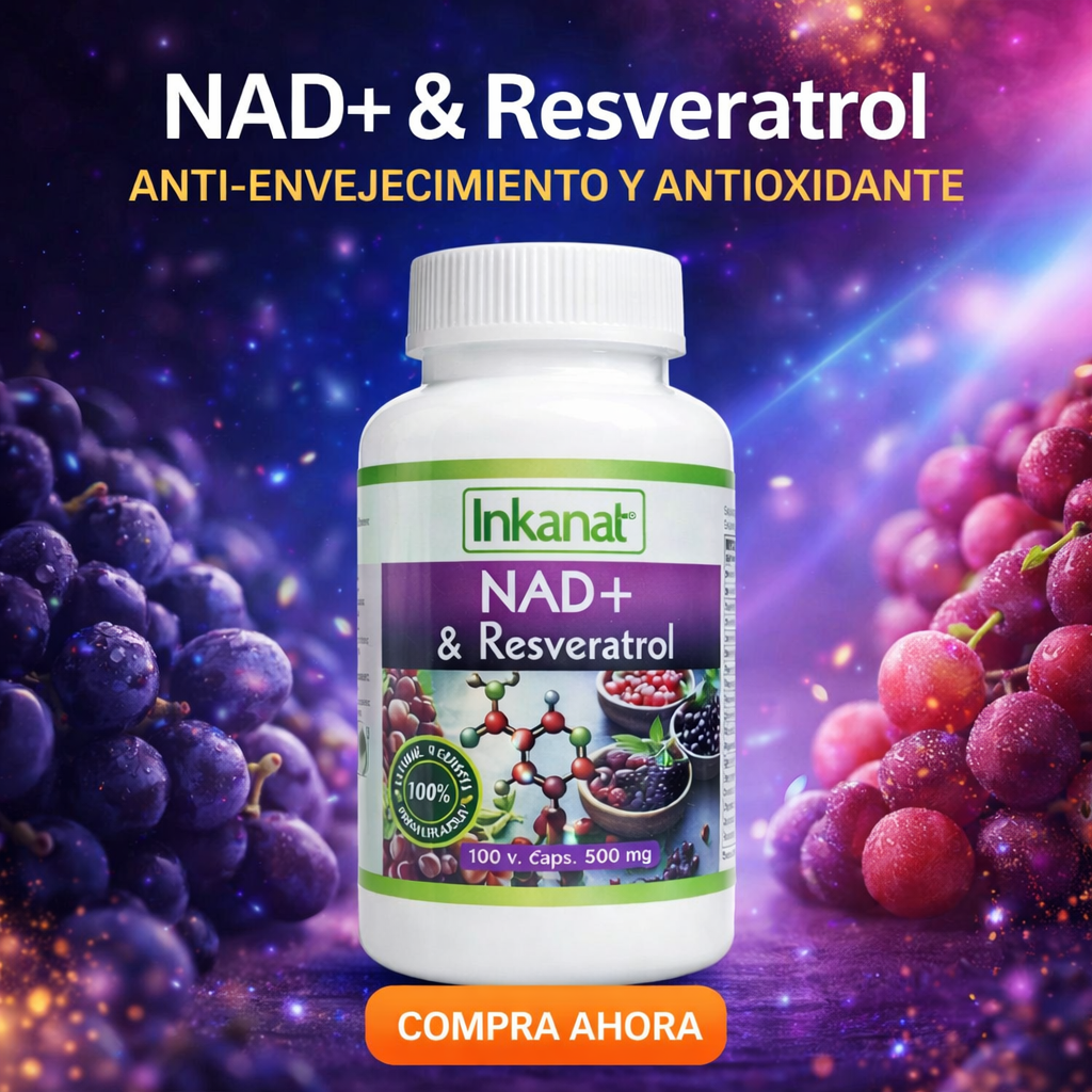 NAD+ & Resveratrol es un complemento alimenticio elaborado a base de nicotinamida adenina dinucleótido (NAD+) y resveratrol, dos compuestos reconocidos por su acción antioxidante y su rol en el metabolismo celular.