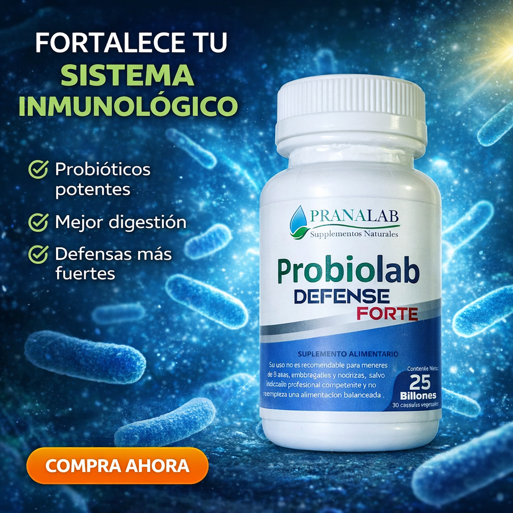 Probiolab Defense Forte es un suplemento alimentario formulado para apoyar el sistema inmunológico y el equilibrio de la flora intestinal. Contiene probióticos microencapsulados de alta potencia, diseñados para contribuir a la salud digestiva, fortalecer las defensas naturales del organismo y favorecer el bienestar general.