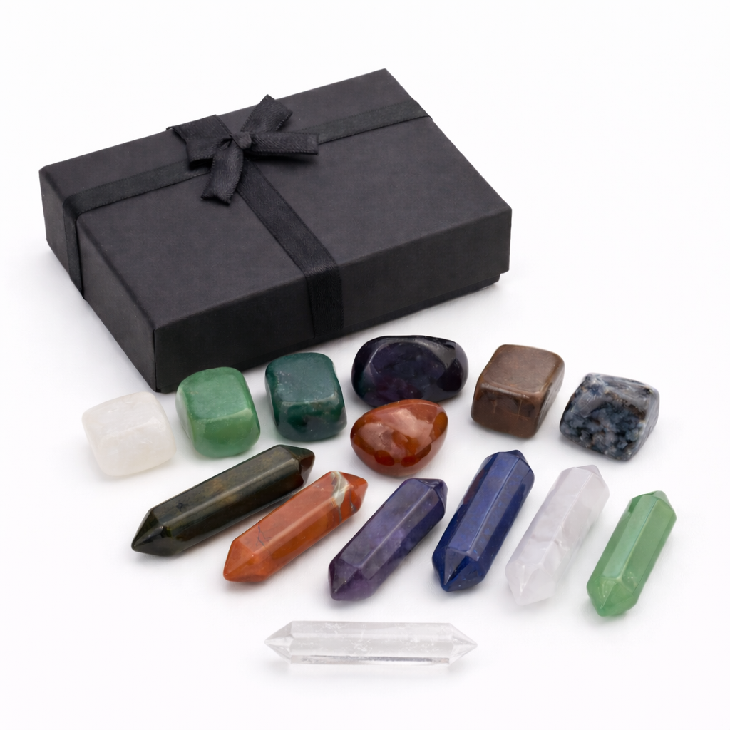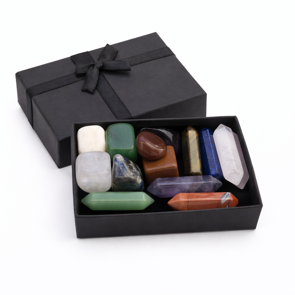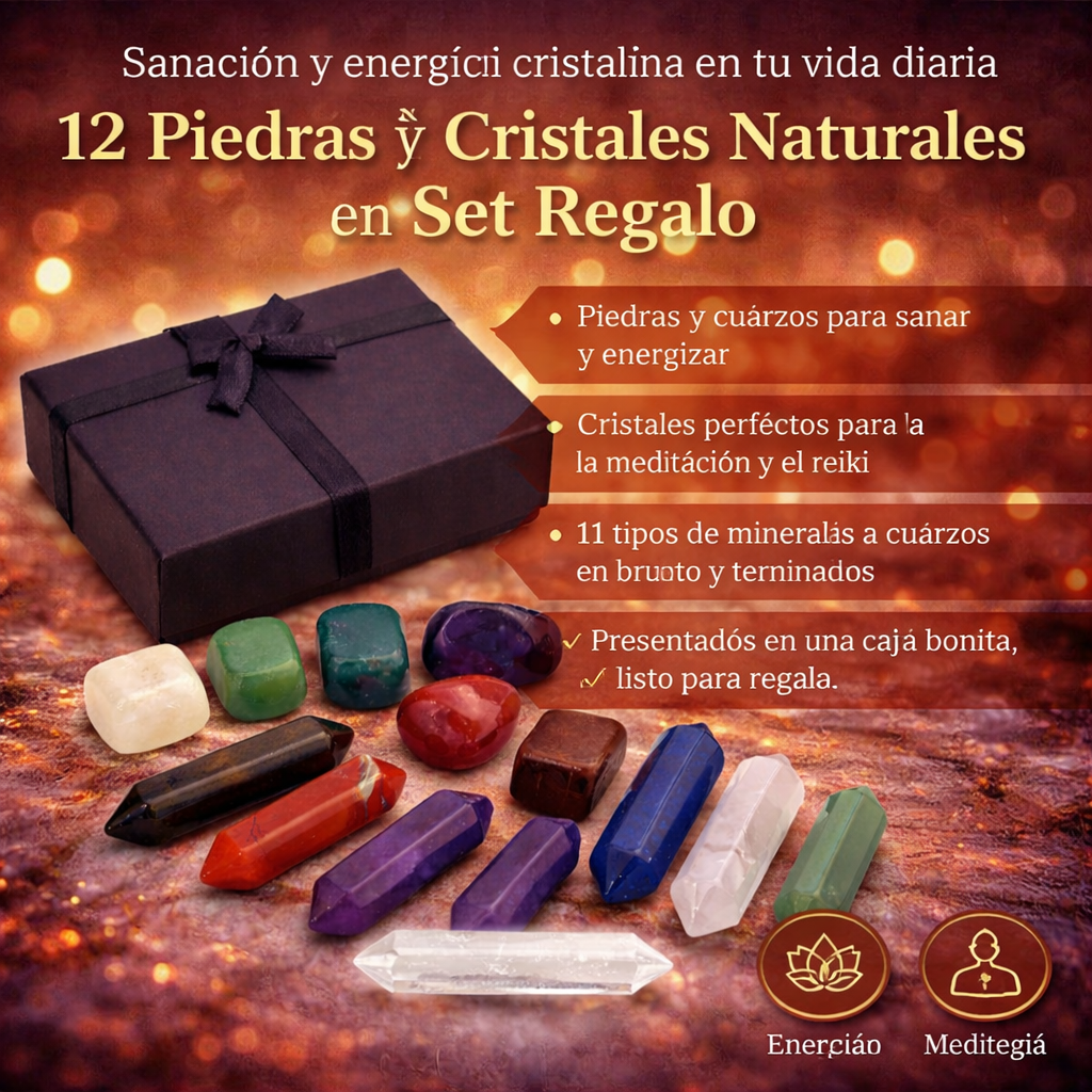 Set de 12 piedras y cuarzos naturales para armonización energética, meditación y reiki. Presentado en elegante caja regalo, ideal para uso personal o ritual.