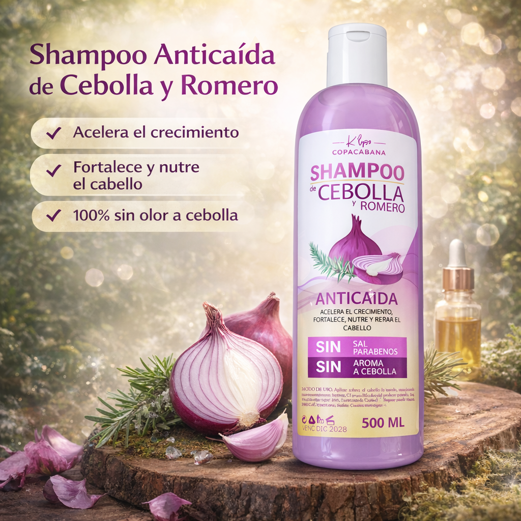 Shampoo formulado con extracto de cebolla y romero, especialmente desarrollado para combatir la caída del cabello. Su acción anticaída ayuda a acelerar el crecimiento, fortalecer la fibra capilar y nutrir profundamente el cabello, dejándolo más resistente, saludable y revitalizado.