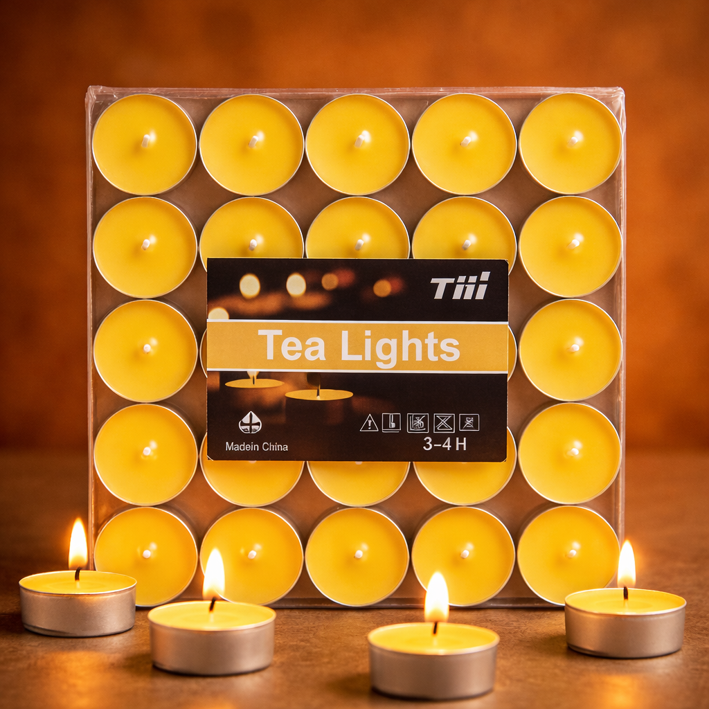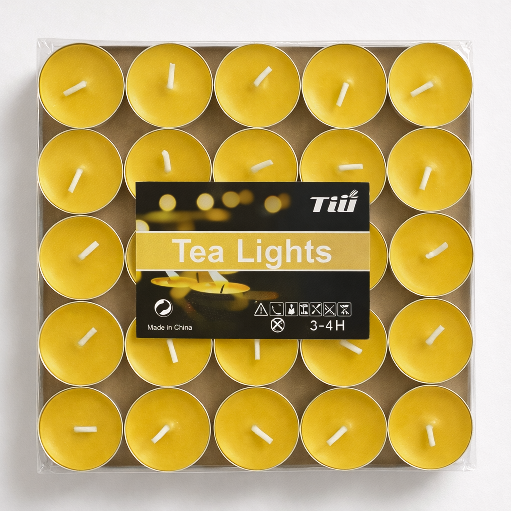 Pack de 50 velas Tea Light color amarillo, ideales para rituales de energía positiva, prosperidad y activación personal.